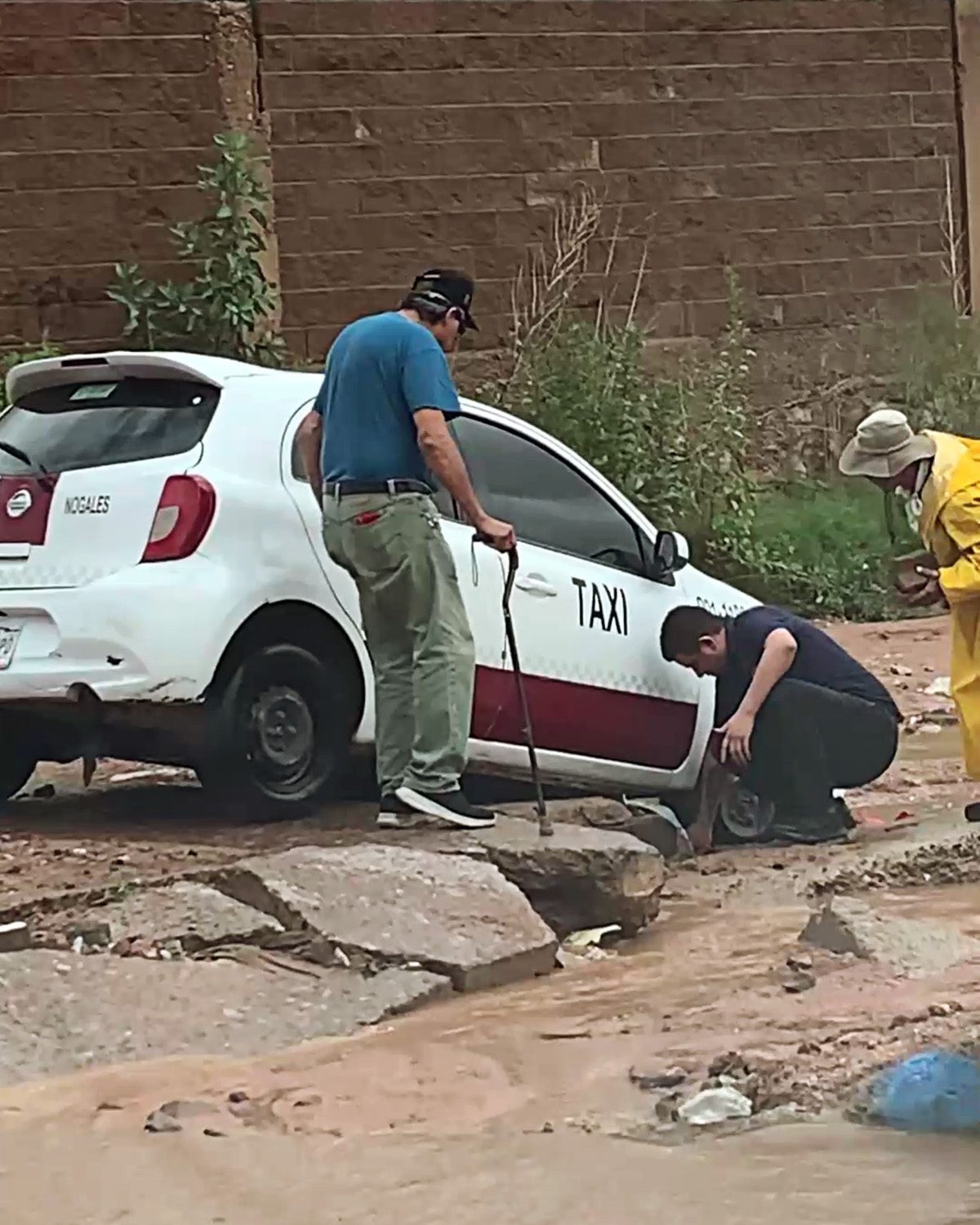 La constante lluvia de este viernes provocó que el suelo se deslavara y dejara al descubierto baches y desniveles. En el lugar, un adulto mayor con bastón y otra persona con impermeable amarillo auxiliaron al conductor.